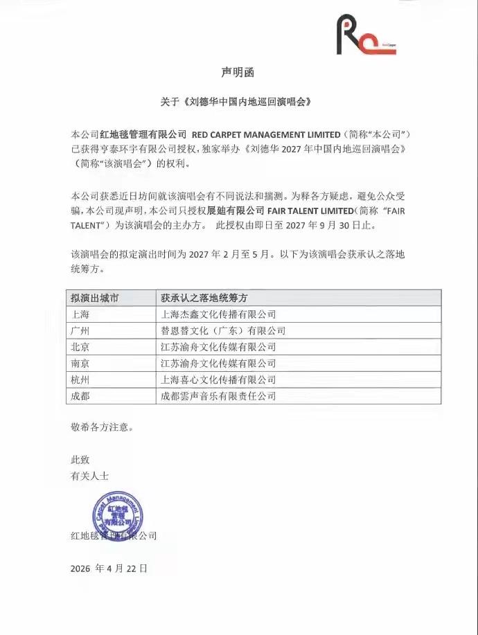 和以往娱乐圈明星习惯预热造势、模糊官宣的方式不同,这次巡演以加盖公章的法律声明直接敲定,授权方、主办方、演出时间、核心城市全部清晰列明,没有任何模糊地带,这份严谨和真诚,从一开始就赢足了好感。
